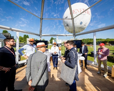 Des participants échangent à l'intérieur d'une bulle transparente lors d’un événement autour du Ballon Generali de Paris, visible en arrière-plan dans le ciel du parc André Citroën.