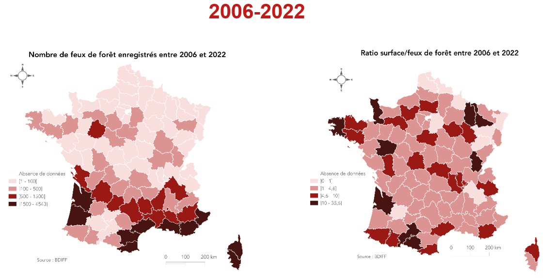Comparaison nombre et surface feux de forêt 2006 2022